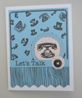 I used all Hero Arts stamps, and the scallop border is a rickrack die from Papertrey Ink. It seemed to mimic the wavy phone cord, and gave the wood grain a whole new look. I like the retro feel.